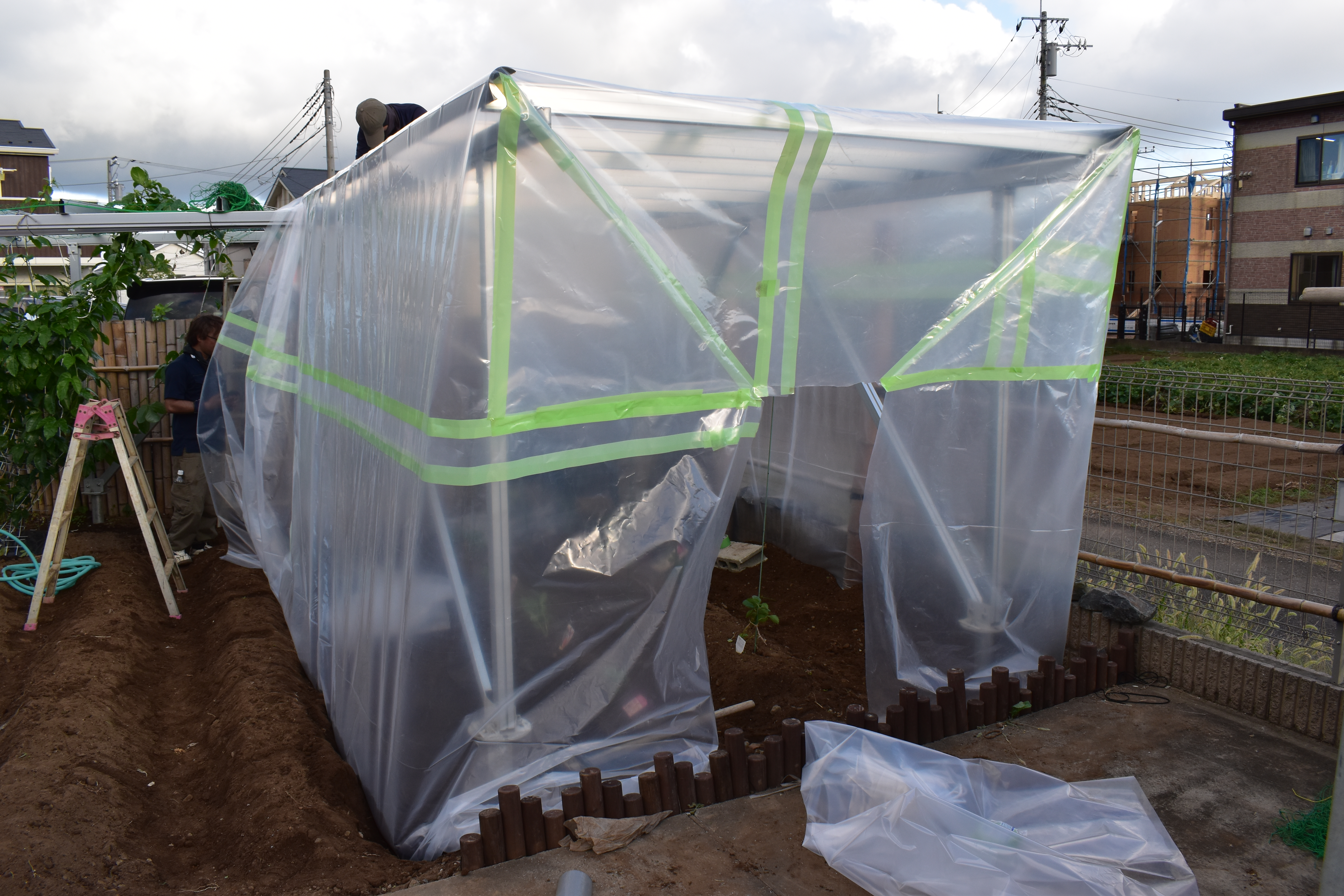 植え付けの日、社員の協力を得まして いちごのための立派なビニールハウスが完成させたのですが…… なんとなんと、先日の台風で壊れてしまいました💦 高クオリティで本格的なビニールハウスだったので残念な気持ちです。